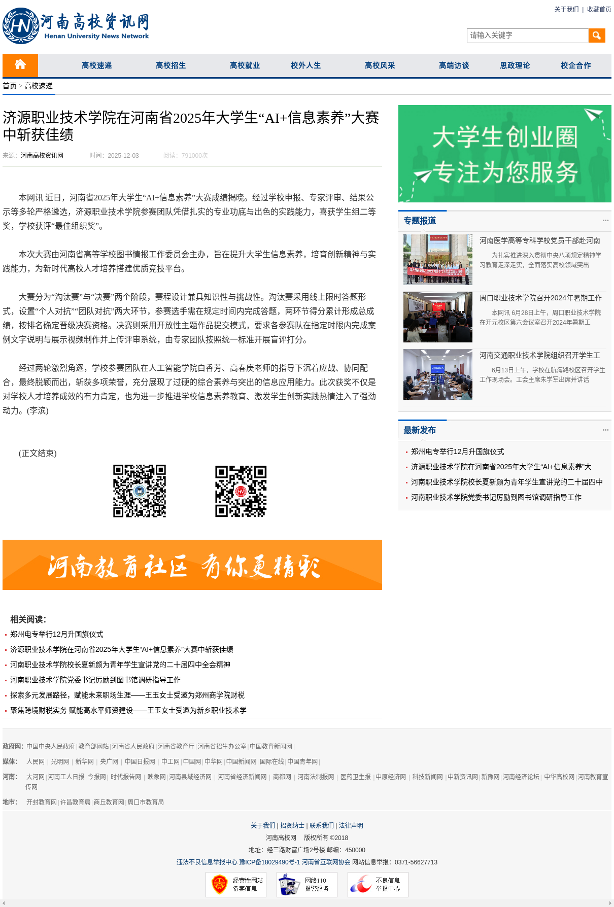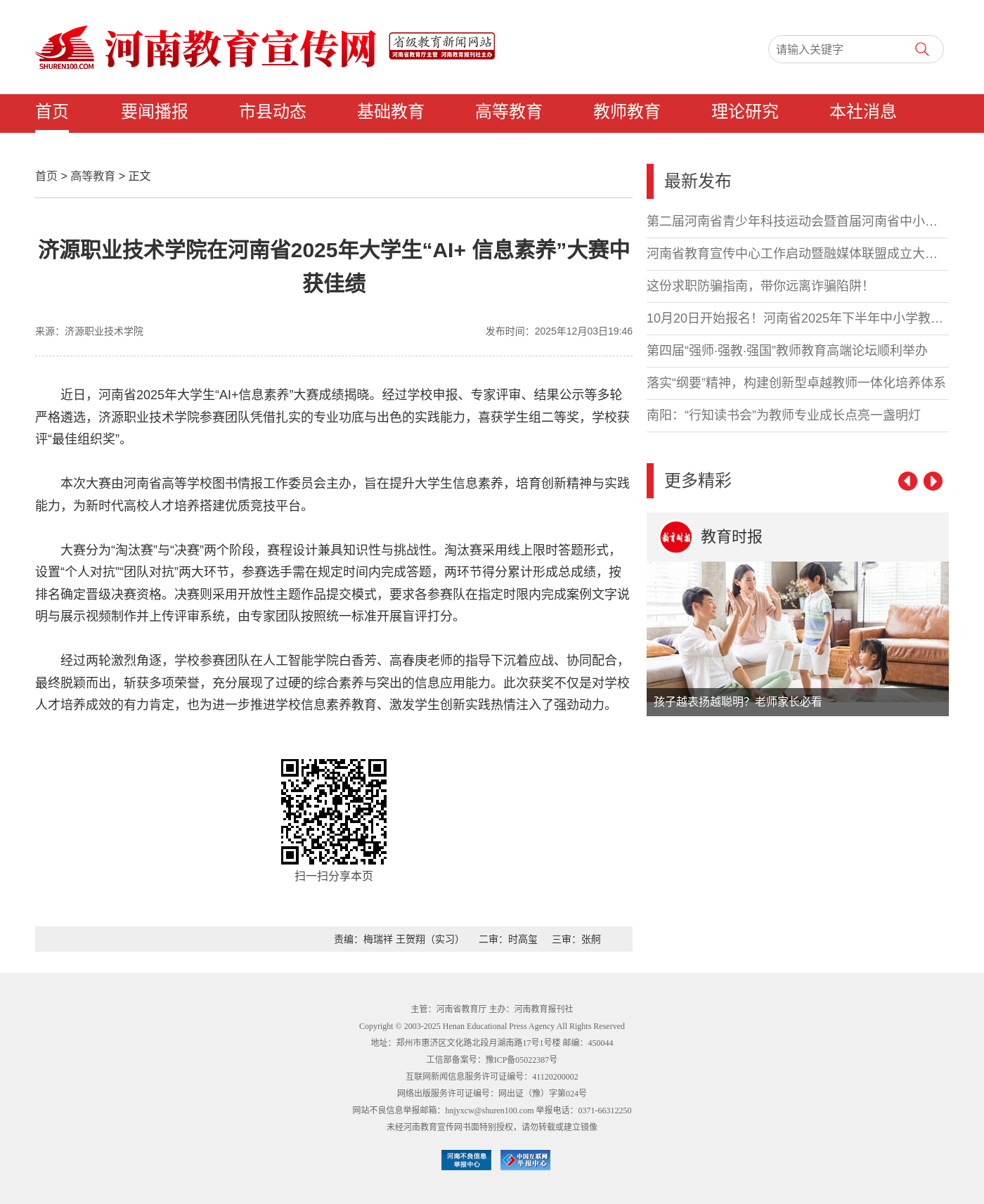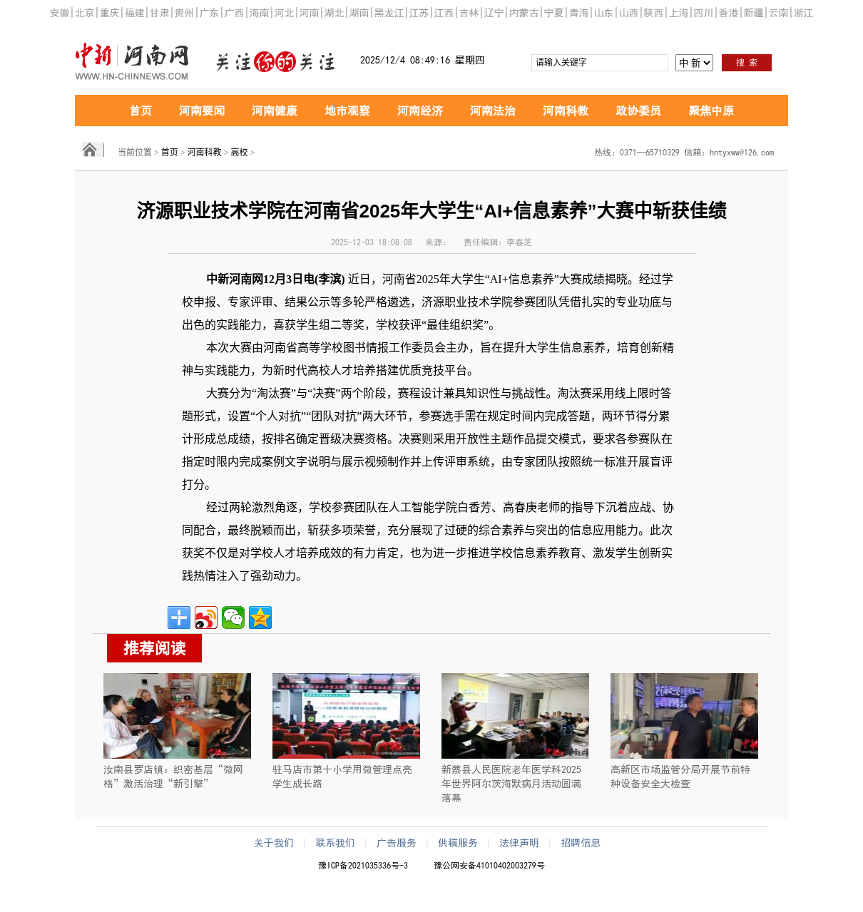 轉(zhuǎn)自2025年12月3日 河南高校資訊網(wǎng)、中華高校網(wǎng)、中新網(wǎng)、河南高校行、河南教育宣傳網(wǎng):濟(jì)源職業(yè)技術(shù)學(xué)院在河南省2025年大學(xué)生“AI+信息素養(yǎng)”大賽中斬獲佳績